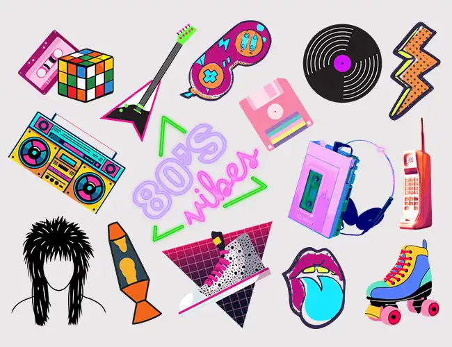15 stk merker som symolyserer 80-tallet – fargetrykk
